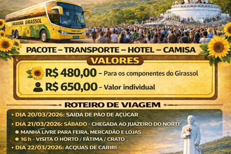 O Grupo Girassol está organizando mais uma emocionante Caravana e Romaria a Juazeiro do Norte, que acontecerá no período de 20 a 24 de março de 2026, em homenagem à Festa de Aniversário Natalício do Padre Cícero, um dos maiores símbolos de fé e devoção do Nordeste.